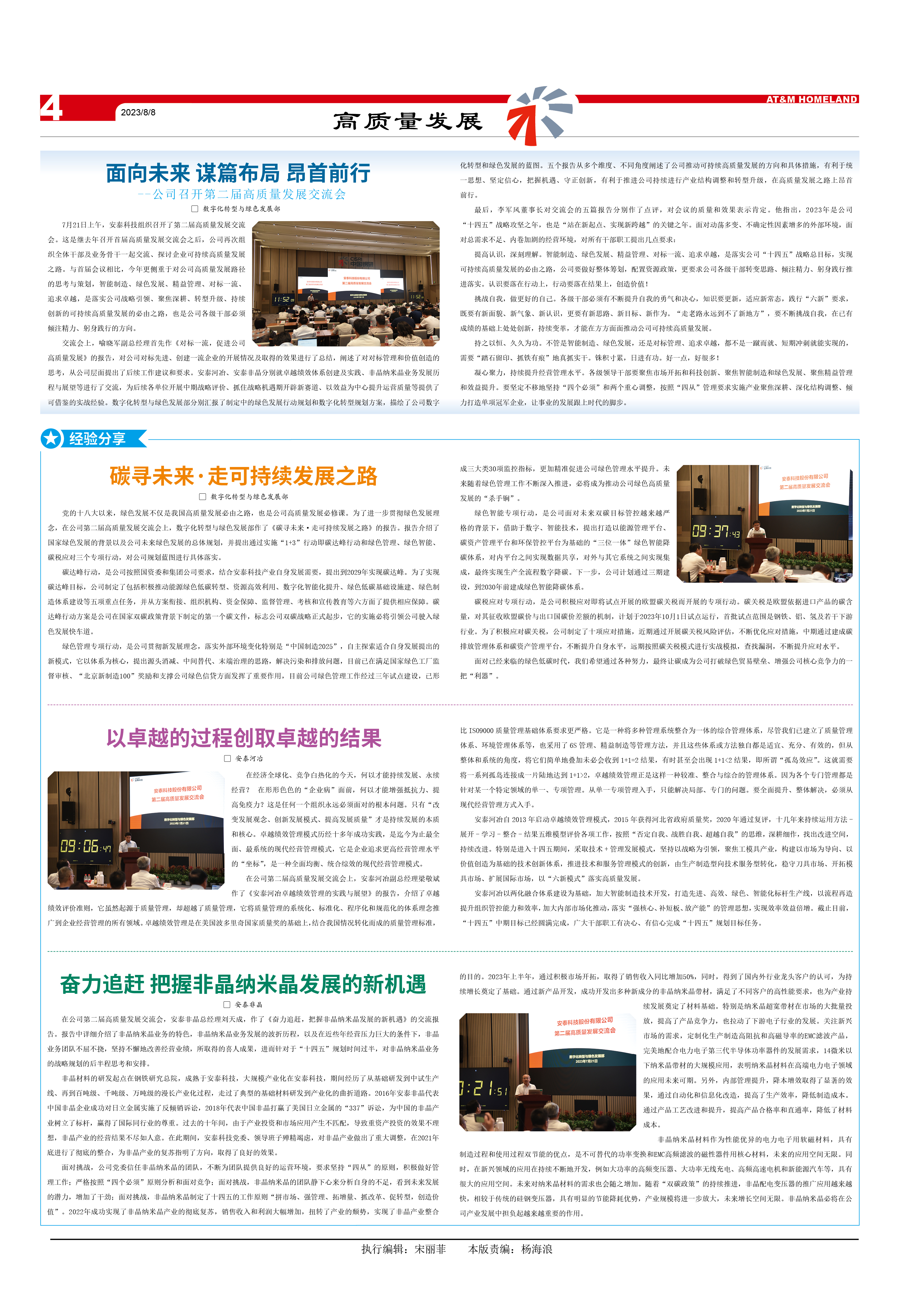 交流会上,喻晓军副总经理首先作《对标一流,促进公司高质量发展》的报告,对公司对标先进、创建一流企业的开展情况及取得的效果进行了总结,阐述了对对标管理和价值创造的思考,从公司层面提出了后续工作建议和要求。安泰河冶、安泰非晶分别就卓越绩效体系创建及实践、非晶纳米晶业务发展历程与展望等进行了交流,为后续各单位开展中期战略评价、抓住战略机遇期开辟新赛道、以效益为中心提升运营质量等提供了可借鉴的实战经验。数字化转型与绿色发展部分别汇报了制定中的绿色发展行动规划和数字化转型规划方案,描绘了公司数字化转型和绿色发展的蓝图。五个报告从多个维度、不同角度阐述了公司推动可持续高质量发展的方向和具体措施,有利于统一思想、坚定信心,把握机遇、守正创新,有利于推进公司持续进行产业结构调整和转型升级,在高质量发展之路上昂首前行。