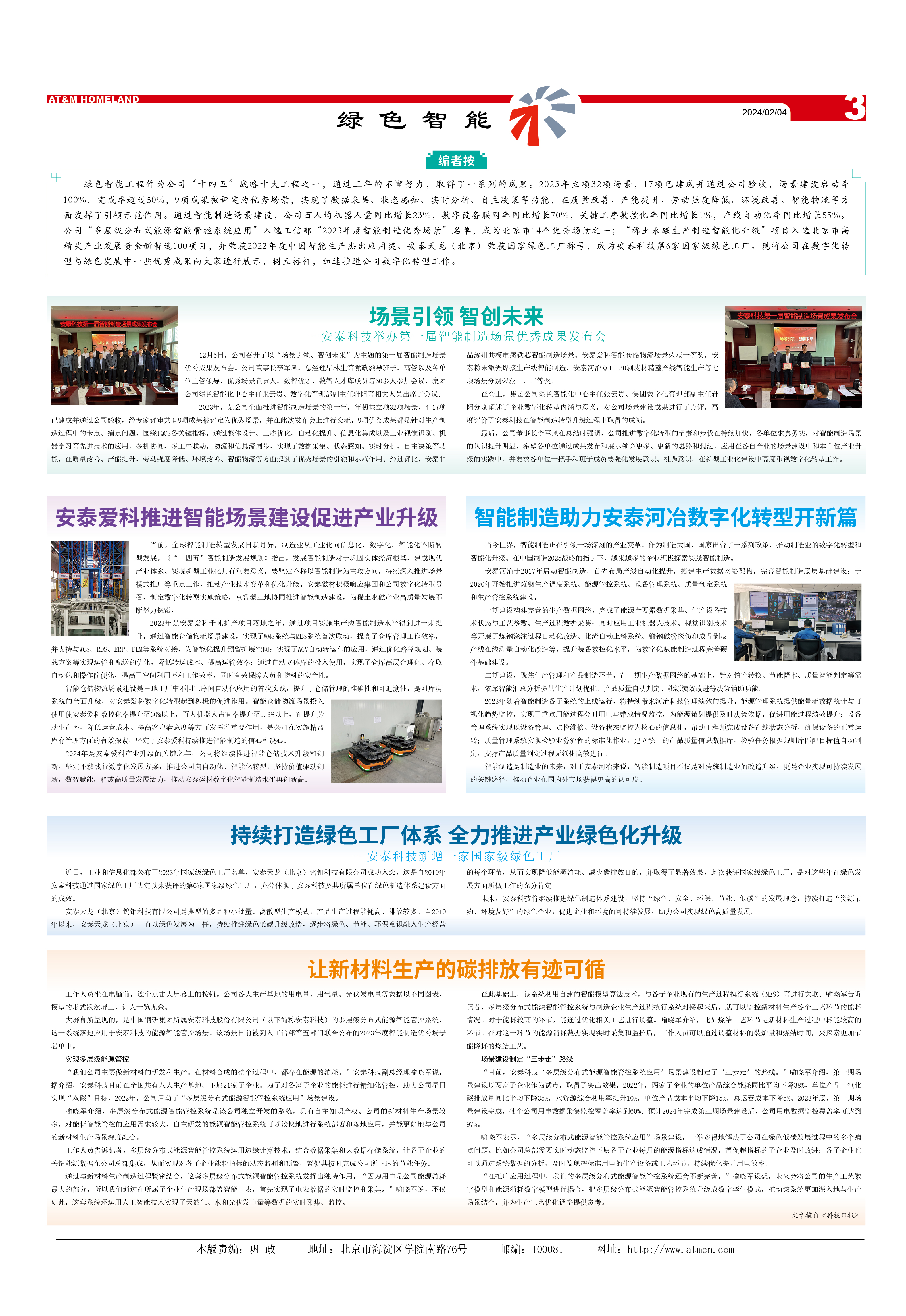 绿色智能工程作为公司“十四五”战略十大工程之一,通过三年的不懈努力,取得了一系列的成果。2023年立项32项场景,17项已建成并通过公司验收,场景建设启动率100%,完成率超过50%,9项成果被评定为优秀场景,实现了数据采集、状态感知、实时分析、自主决策等功能,在质量改善、产能提升、劳动强度降低、环境改善、智能物流等方面发挥了引领示范作用。通过智能制造场景建设,公司百人均机器人量同比增长23%,数字设备联网率同比增长70%,关键工序数控化率同比增长1%,产线自动化率同比增长55%。公司“多层级分布式能源智能管控系统应用”入选工信部“2023年度智能制造优秀场景”名单,成为北京市14个优秀场景之一;“稀土永磁生产制造智能化升级”项目入选北京市高精尖产业发展资金新智造100项目,并荣获2022年度中国智能生产杰出应用奖、安泰天龙(北京)荣获国家绿色工厂称号,成为华体会网页版登录入口第6家国家级绿色工厂。现将公司在数字化转型与绿色发展中一些优秀成果向大家进行展示,树立标杆,加速推进公司数字化转型工作。
